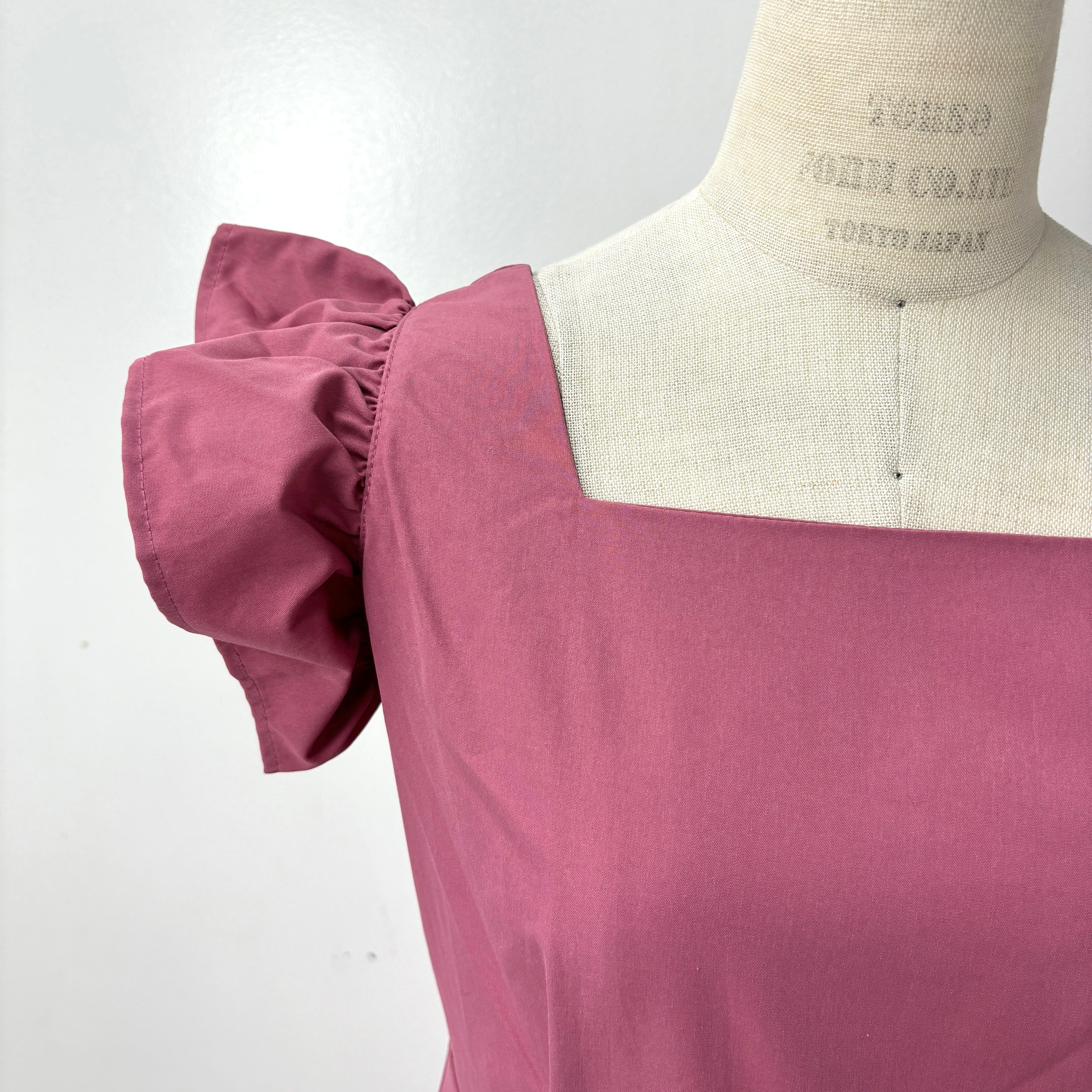 ピンク色の袖のフリルが可愛いロング丈ワンピース。