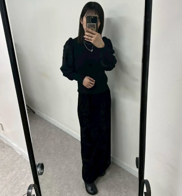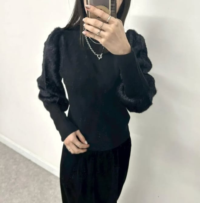 身頃はスッキリとしたリブ編み、袖はふんわりとした素材感のコントラストが、女性らしい柔らかさと華やかさを引き立てます。 首元は上品なハイネック仕様で、コートのインナーとしても映える一着。