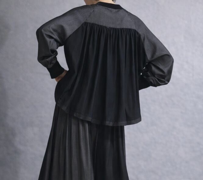 メインに使用している「テンセルデニム風布帛」は、デニム特有の奥行きのある表情を持ちながら、レーヨンを贅沢にブレンドすることで、驚くほどしなやかで瑞々しい「とろみ」を実現した素材です。肌を優しく撫でるようなソフトな質感は、春夏の陽気にふさわしい清涼感を備え、カーディガン感覚でさらりと羽織れる軽やかさが魅力。ポリエステルを配合することでシワになりにくい安定感もプラスしており、日中脱いでバッグに忍ばせても美しさを損なわない、大人の日常に寄り添う機能的な素材に仕上がっています。