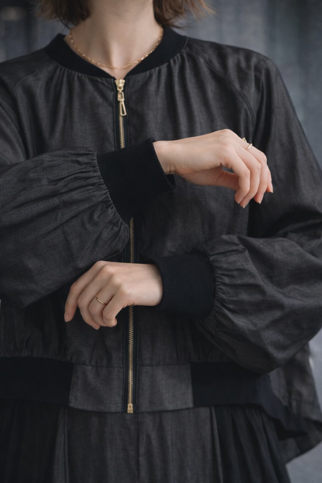 テンセルデニム風布帛 ロングテール 配色 ジップアップ ブルゾン ブラックミックス