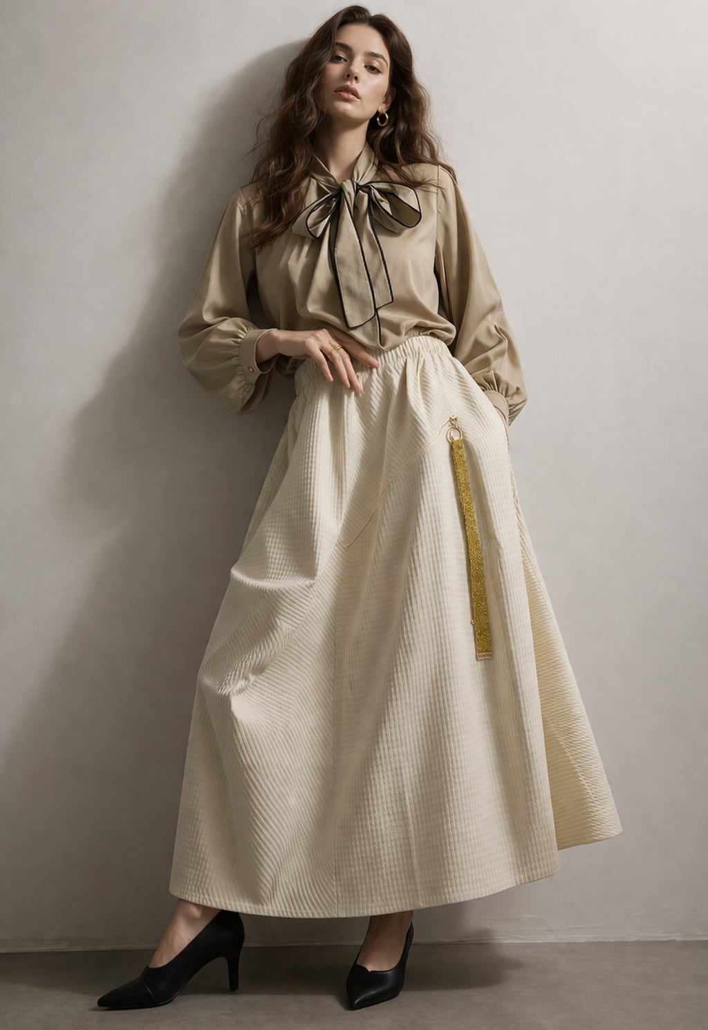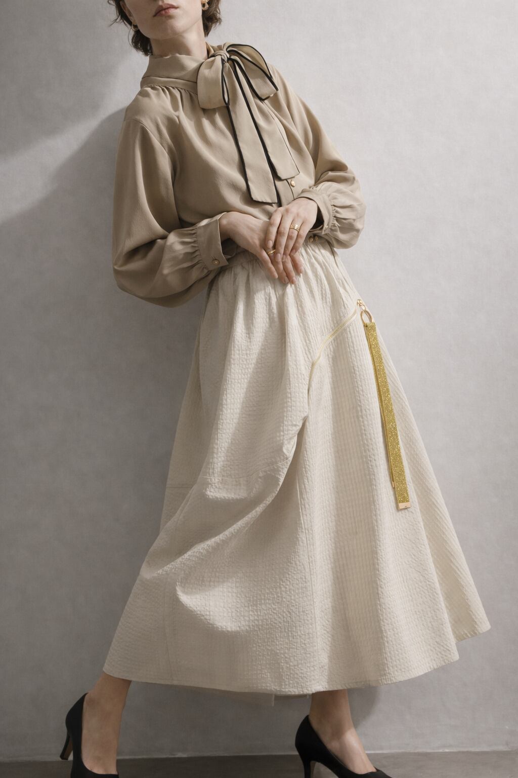 格子ジャガード ゴールドテープ アシメ ロング スカート エクリュ
