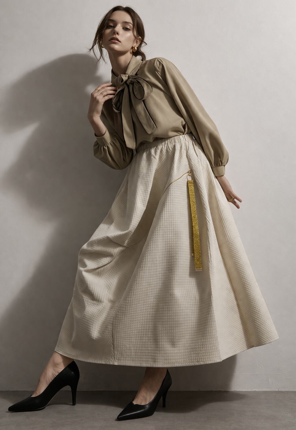 定番のフレアスカートに、エッジの効いたゴールドテープを走らせることで、モダンな躍動感をプラスした一着です。最大の特徴は、計算された切り替えが生み出すイレギュラーなヘムライン。前後左右で異なる着丈が視覚的なリズムを作り、歩くたびにゴールドのラインが空を切るように煌めき、どこから見ても新しい表情を覗かせます。広がりすぎない絶妙なフレアシルエットに仕立てることで、甘さを抑えた大人の強さを表現。ウエストはゴム仕様でリラックスした穿き心地を叶えつつ、タックインした際にもデザインの軸となるテープが腰回りをシャープに引き締めます。